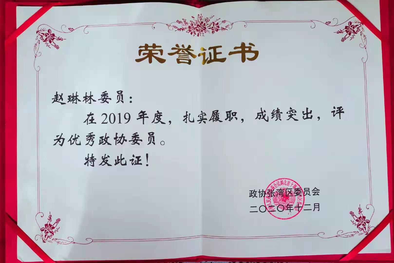湖北震序車船科技股份有限公司黨支部書記兼副總經(jīng)理趙琳林同志的獲得了張灣區(qū)政協(xié)2019年度優(yōu)秀政協(xié)委員稱號,其《